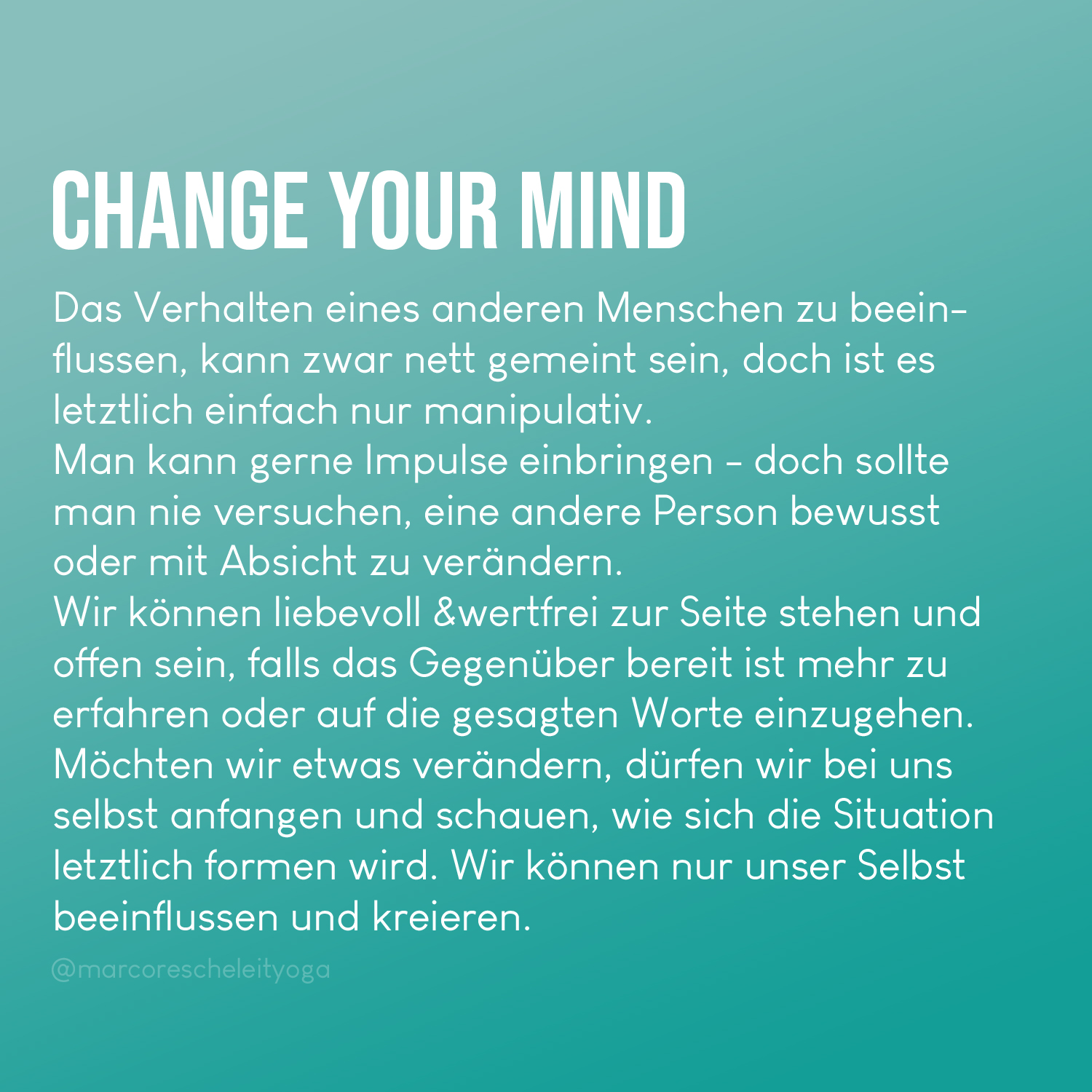 Möchten wir etwas verändern, dürfen wir bei uns selbst anfangen und schauen, wie sich die Situation letztlich formen wird. Wir können nur unser Selbst beeinflussen und kreieren.